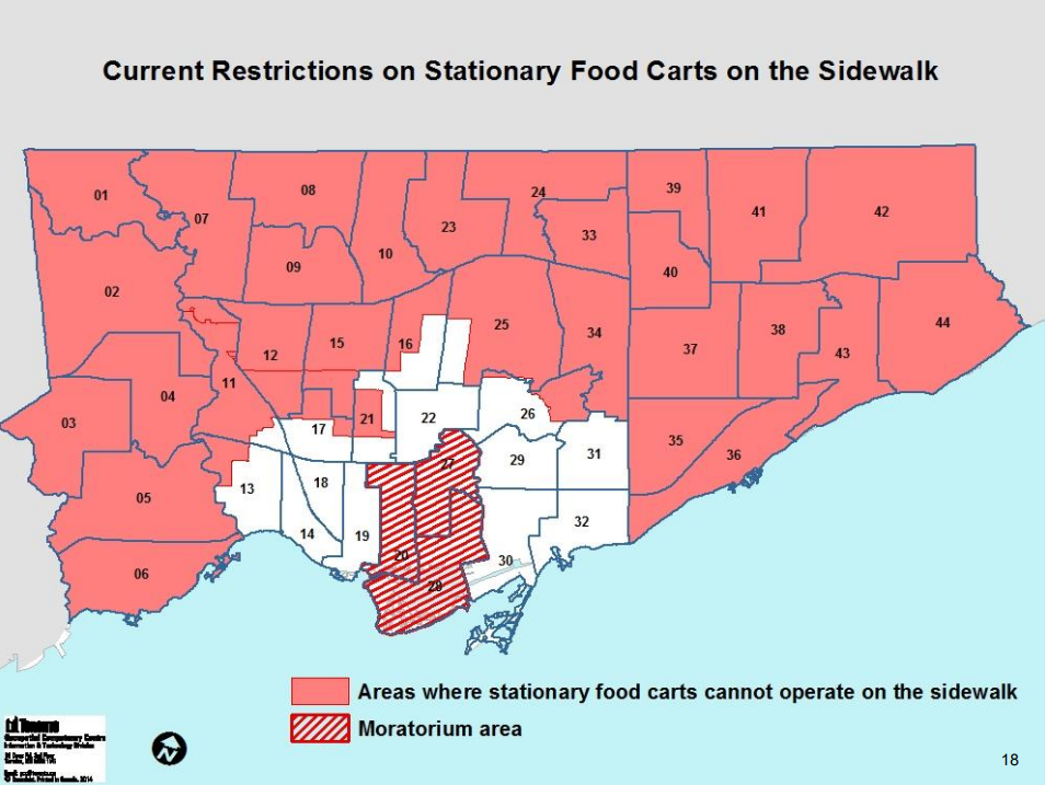 Since 2002, a moratorium on new vending licences has remained in effect in three major downtown wards (at the time, wards 20, 27, and 28). While the legislation described itself as “temporary” when first adopted, the conclusion states that “no applications received after February 25, 2002 shall be processed until a new harmonized vending by-law has been adopted by City Council.” Unsurprisingly a “harmonized vending by-law” never materialized and the legislation remains in effect twenty-three years later. This legislation was purportedly intended to stem the “concentration” of vendors in the downtown core, and in this regard it was wildly successful. Many who take on this job do so for the rest of their lives, but because licences can’t be sold, transferred, or inherited, food carts and the spots they occupy simply vanish as older vendors retire, close shop, or pass away. Moroney describes this as a strategy of “attrition” by a city comfortable with simply outlasting the remaining vendors.