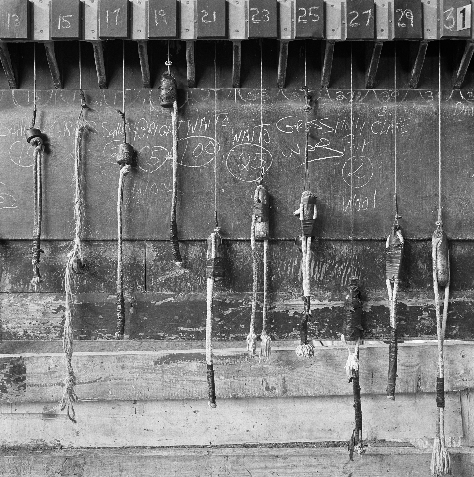 The one exception was a view I took of a panel consisting of a blackboard behind a row of numbered pull cords, whose purpose I no longer remember. Judging from another photo I took in the same area, it seems to have been part of a mechanism for remotely opening the doors of holding pens by means of cables, pulleys and levers.