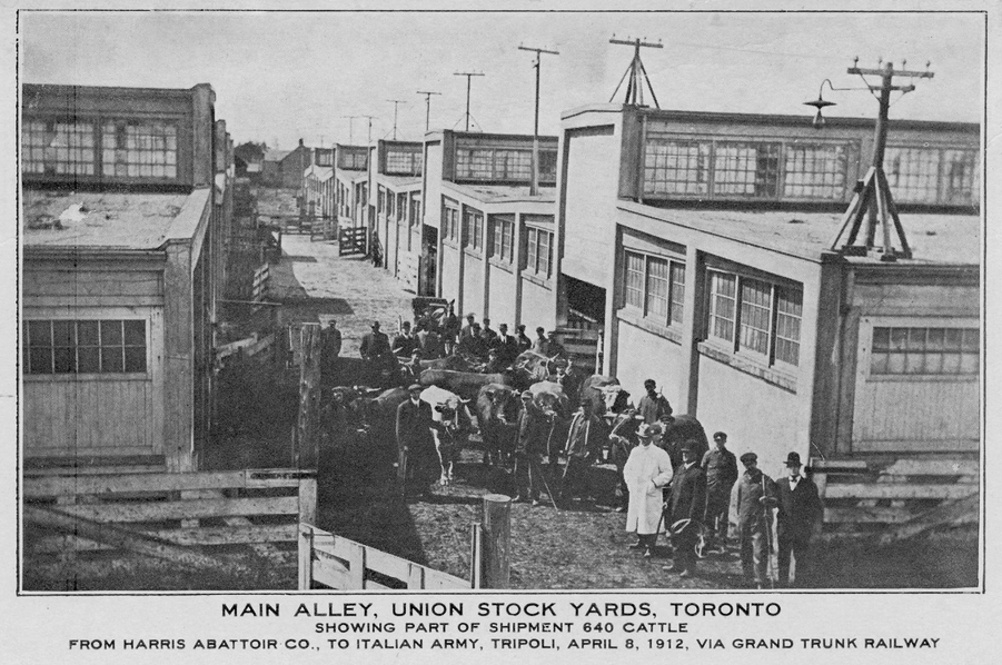 The neighbourhood designation “Stockyards District” evokes indistinct memories of what for much of the twentieth century was one of Toronto’s most concentrated zones of heavy industry. Sadly, nothing remains to mark the site of the Ontario Stockyards, originally the Union Stockyards, the hub around which the city’s meat packing industry coalesced after 1903.