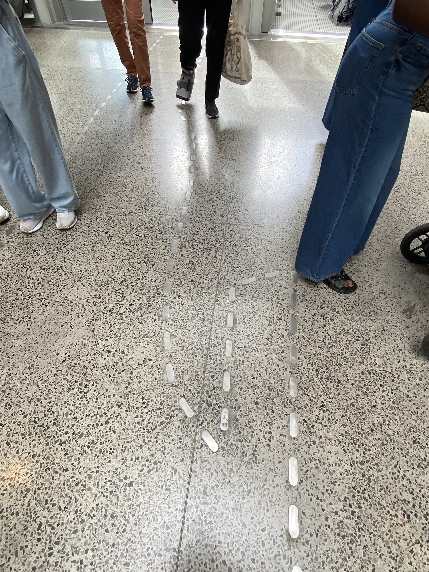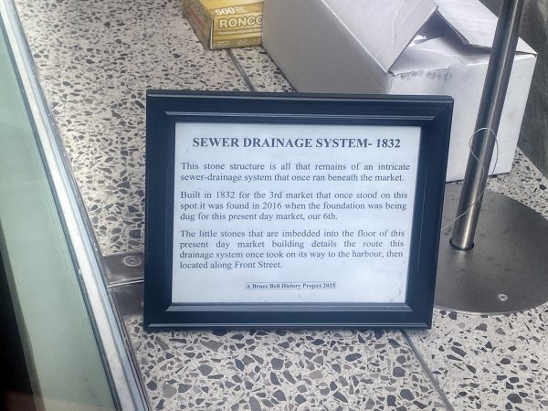 A small cheaply framed sign the size of a sheet of paper is propped up next to the drain, with the title, “Sewer Drainage System — 1832.” In two short paragraphs, it explains what you’re looking at, and then points out that the “little stones embedded into the floor of the present-day market building details the route this drainage system once took on its way to the harbour…” The sign is signed, “A Bruce Bell History Project, 2025.” It’s not even from the city.