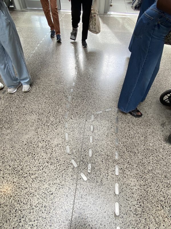 The drain fragment that survived the subsequent value engineering is contained in a sunken viewing box about the size of a parking space, situated near the back of the hall. It sits under highly reflective glass, which makes the drain difficult to see, and is back lit with a vaguely creepy yellow-ish light, for reasons that surpass comprehension.
