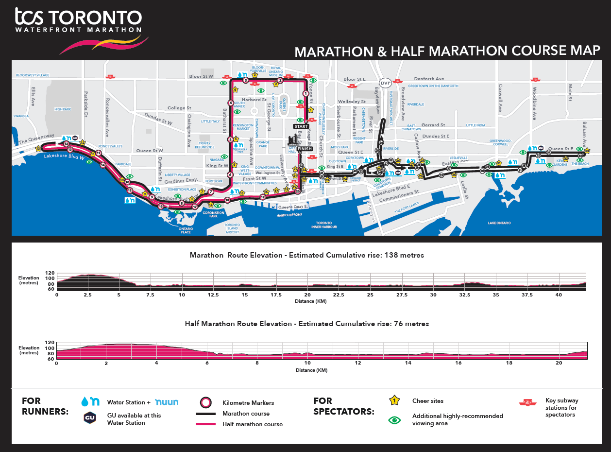 Chris Fagel is President/CFO of Canada Running Series, which organizes the marathon, and the longtime course director. He describes the challenge of designing all at once for a full marathon, a half-marathon, and a 5k run: “How do you have a route that’s 42 kilometres, a route that’s 21 kilometres, another route that’s 5 kilometres, that start and finish in the same place?” The technical puzzle is constant. Add to that the geographical constraints: “Toronto has some unique challenges … we’re surrounded by water on the south and hills to north and runners don’t like either of those things.”