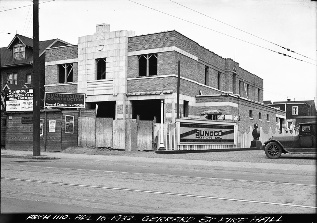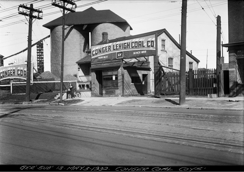 At Gerrard and Carlaw, the elevated rail corridor passes over the intersection at a 45 degree angle, leaving a trapezoidal site at the northeast corner. This alignment was determined when the Grand Trunk Railway’s Montreal line was driven through the city’s east end in the 1850s, predating the street grid. The irregular site was initially occupied by heavy industries, including the International Varnish Company and John Banfield & Sons, makers of lighting fixtures and an innovative portable wind-up phonograph.