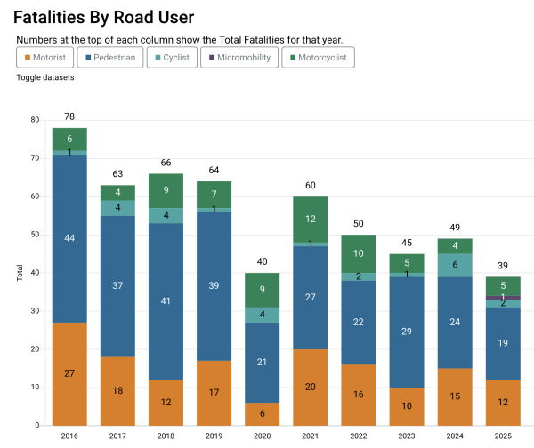 The city’s Vision Zero team released its 2025 data yesterday and the trend lines are encouraging: overall, the number of traffic-related deaths — 39 for last year — is down from the three previous years, and there’s clear evidence of improvement over the decade since Toronto adopted the Scandinavian safety strategy.