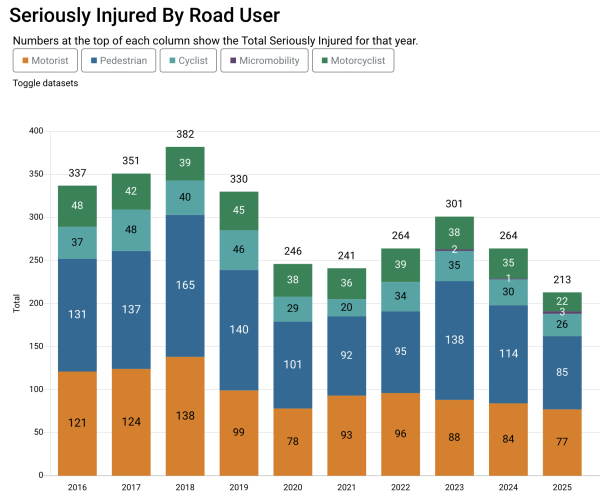 In particular, annual pedestrian deaths have declined steadily from 44 (2016) to 19 (2025), with the exception of the asterisk year — 2020, when everything dropped a lot because of the pandemic. The number of serious injuries has also dropped consistently, from a high point of 165 in 2018 to 85 last year — an impressive improvement.