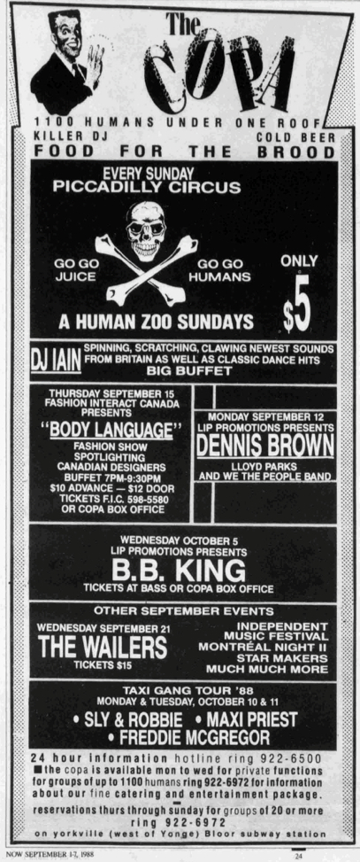 Cliff continued to perform in Toronto, at venues such as the Ontario Place Forum, the Concert Hall and the Copa, a popular Yorkville dance club on Scollard, which hosted many other reggae legends like Sly & Robbie, Maxi Priest, Freddie McGregor, and Burning Spear.