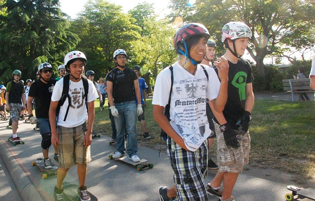 Just a few of the hundred or more skateboarders who were rolling towards Brockton Point on the Stanley Park Seawall (map here) to join in the 125th birthday party of the City of Vancouver a month ago. (Question: what’s the collective? A flip of skaters? A slam? A kick?)