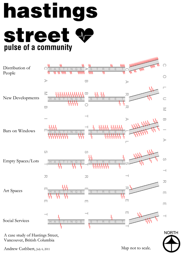 The data for the map graphic “Hastings Street: Pulse of a Community” was collected on the basis of ‘street feel’. The map itself was meant to capture an impression of Hastings and to show how different seemingly unrelated elements work together to form an impression of the street as a place in transition.