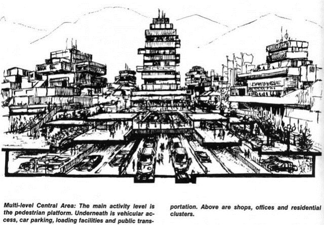 Throughout the text, Sixta discussed the vitality of areas and their ability to attract pedestrian activity during all times of the day… He imagined that some sort of high frequency rapid transit line would run through the core of these Metro Towns. He advocated for a high quality urban environment with strong variety and high amenity. He suggested that automobiles should be moved underground to accommodate the free-flow of pedestrians.