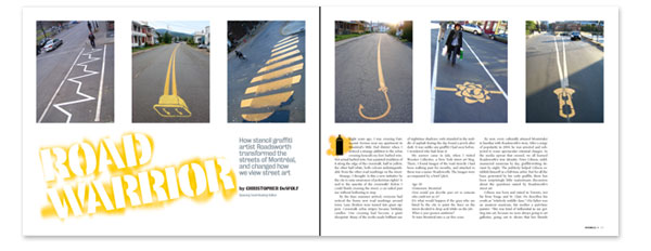 • The Rise of Roadsworth/Peter Gibson: Contributing editor Christopher DeWolf looks back how this stencil graffiti artist transformed the streets of Montreal and changed how we view street art