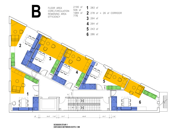In the shape of a flatiron with its opposite face on Hastings, each of the floors’ six units wrap around a service core with elevator and exit stair, the decision having been made by the architect early on to move the new elevator to a more efficient location. A rooftop garden and bike room are also offered as an amenity and in lieu of there being no car parking.