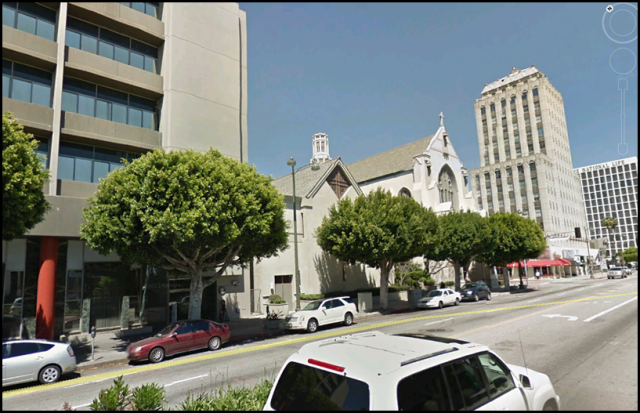 Looking east on Wilshire Blvd. with the Brown Derby Restaurant prior to the derby-shaped building, the St. James Church, and the Wilshire Professional Building in 1931. Storefronts were built in 1929.