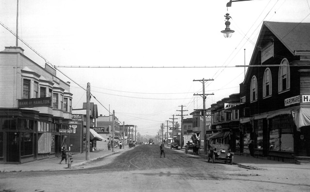This is 3500 – 3600 Commercial Street – not Drive – and was originally developed as a result of the 18th Avenue tram stop for the B.C. Electric Interurban Railway between New Westminster and Vancouver. (Map here.) As the railway pushed out into what had once been farmland in Cedar Cottage, small independent villages like this one at sprung up. Its vibrancy was short lived, as the advent of the automobile in 1910-20 led to Kingsway’s commercial dominance.