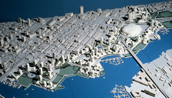 One of the early major planning exercises for False Creek North was the “Lagoons Plan”, that included artificial inlet lagoons separating islands of development from the structure of the downtown. This scheme proposed the development of an artificial waterfront on what is currently Pacific Boulevard. The plan, however, was criticized by reviewers and the public for having an “elitist” nature where tower clusters on islands were separated from the city by their moat-like inlets.