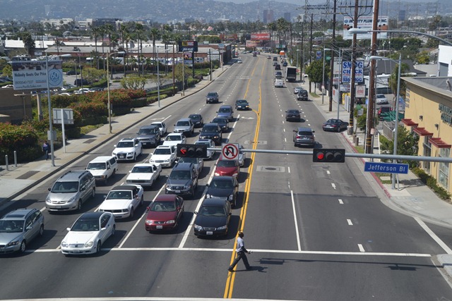 This is La Cienega Boulevard, looking north at Jefferson from the platform of a newly opened Expo-line light-rail station (map here). The pedestrian, you notice, is obediently sticking to the crosswalk as the traffic piles up.
