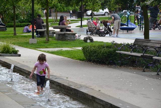 A kilometre away, as the crow flies: a child in the stream at Emery Barnes Park, in the heart of Downtown South (map here).