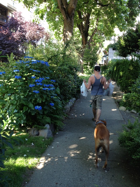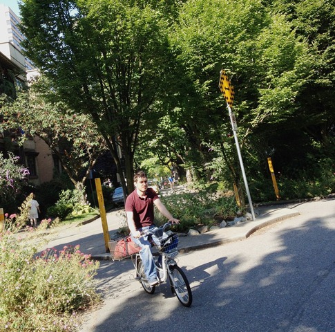 The Haro and Cardero corner (map here) is just a block from the intensity of Robson – and yet people feel comfortable walking down the centre of the street. That’s the effect of traffic calming*: those breaks in the grid where diverters, miniparks and roundabouts have not only discouraged through traffic but also offered small opportunities for planting. And the result is an extraordinary lushness.