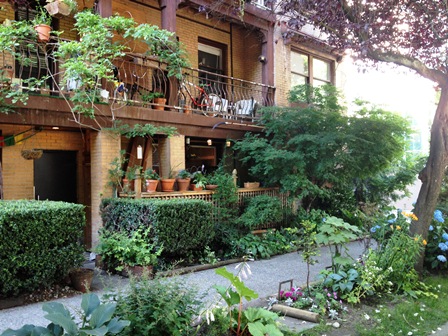 on the northwest corner, a brick apartment building from the 1920s – double-hung windows and cluttered balconies big enough for barbeques and close enough for conversation. On the northeast, four surviving houses, comfortably maintained without being overly precious.