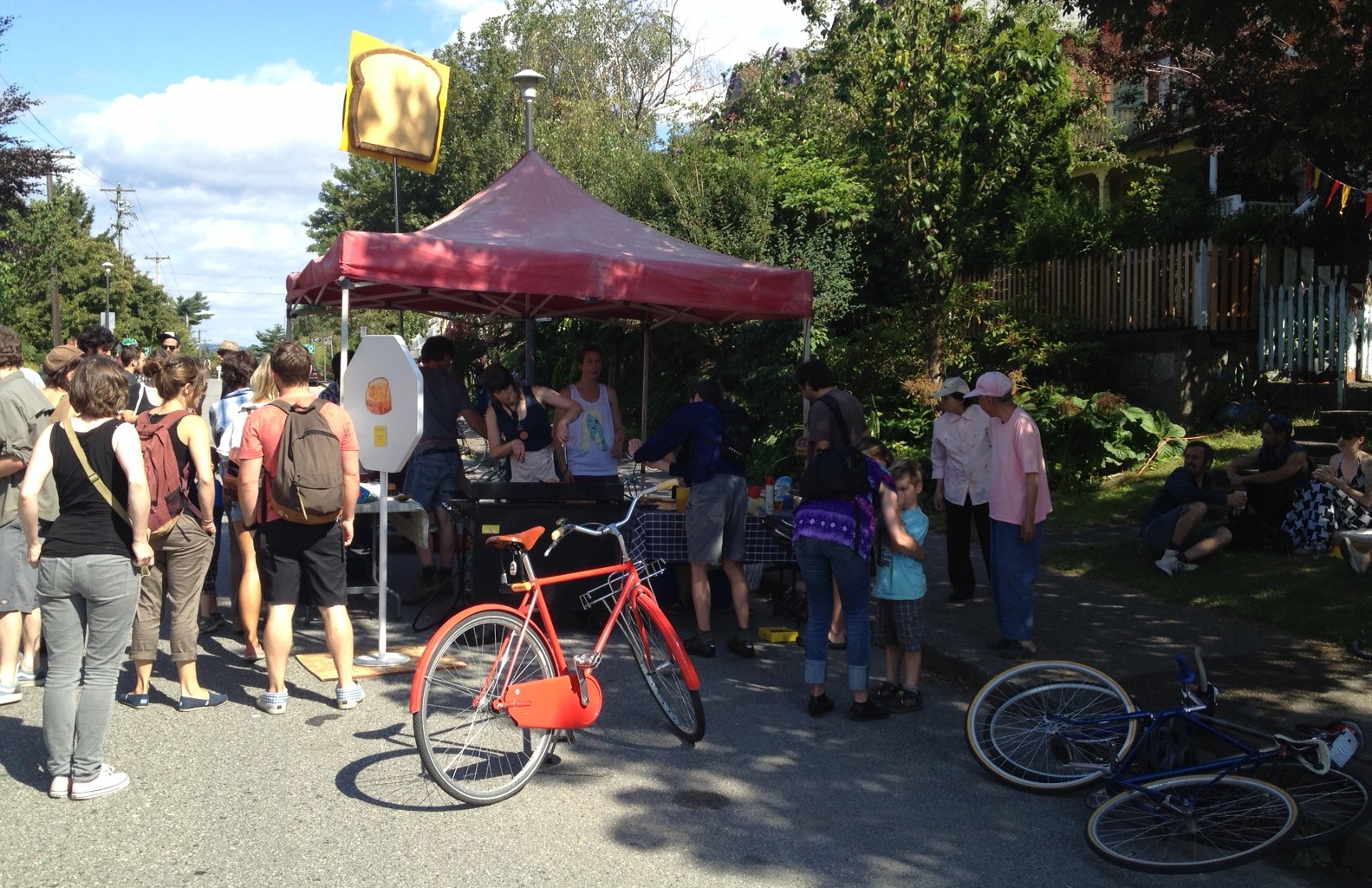Using funds including a grant from the Vancouver Foundation along with a strong sense of the power of civic altruism, this festival showed what happens when people take over their street with a mind to making a people place and simple fun. A grill station and tent was matched with party music and cheesy sandwich art and signage.