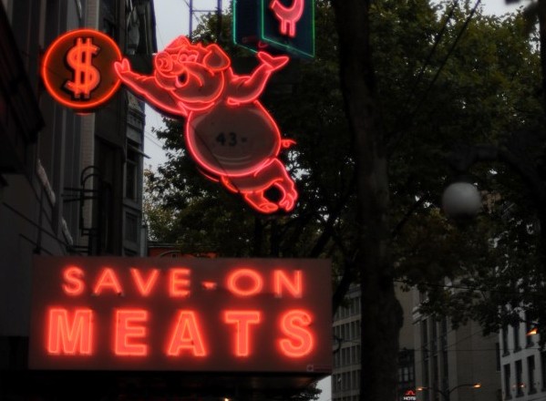 The bright pink neon sign above Save-on-Meats, with its inexplicably cheerful pig, has made the building an iconic Vancouver landmark. When owner Al DesLauriers announced that he was retiring, and that Save-on-Meats might be closing, among the many looming questions was of the fate of the infamous signage. One of the few neon signs to survive the anti-neon campaigns of the 1970s, it appeared that the city might lose one of the last remaining examples of the history chronicled in the Neon Vancouver | Ugly Vancouver permanent exhibit of the Museum of Vancouver. However, when restaurateur Mark Brand bought the endangered butcher shop and restaurant, the neon sign was saved. Save-on-Meats was reinvented, yet not so much that this influential business is unrecognisable.