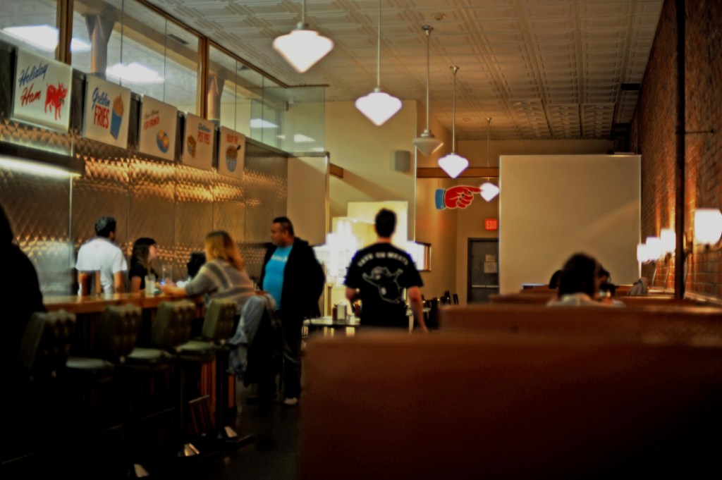 Re-imagined as a retro, 1950s style diner, the new Save-on-Meats plays off of the building’s history and the history of the old, working class neighbourhood in which it is embedded. It sells hamburgers, sandwiches, fries, and other diner classics, as well as offering a breakfast menu. However, the menu also features gentrified cuisine, such as a $12 salad with lettuce, apple, avocado, cucumber, and goat cheese in citrus vinaigrette. The soda fountain offers treats perfect for those too old to order off the kids’ menu, and the drinks menu includes milkshakes with 2oz of alcohol in each. The prices are reasonable for the cuisine, but are more expensive than those at the old Save-on-Meats. Despite efforts to mitigate the harms of commercial gentrification, it remains to see what impact this trendy retro diner will have in a neighbourhood still waging a pitched battle over urban renewal, social exclusion, and the right to food.