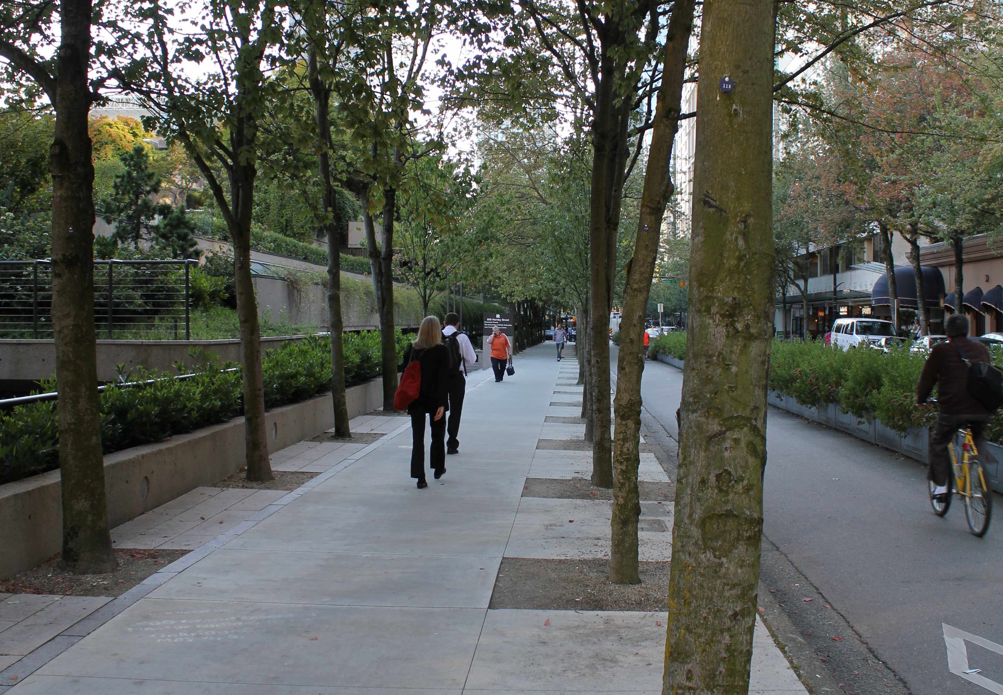 So, now that you have made that difficult decision, make it an enhanced bike lane. What do we mean by “enhanced”? Some kind of physical separation, whether it is planters that we have here [on Hornby street] or whether it is the plastic bollards, anything. Any kind of physical separation where the car driver will say to themselves “I am not going to go in there, because it will scratch the paint on my car. Any physical thing that gives the cars a reason makes a huge difference.