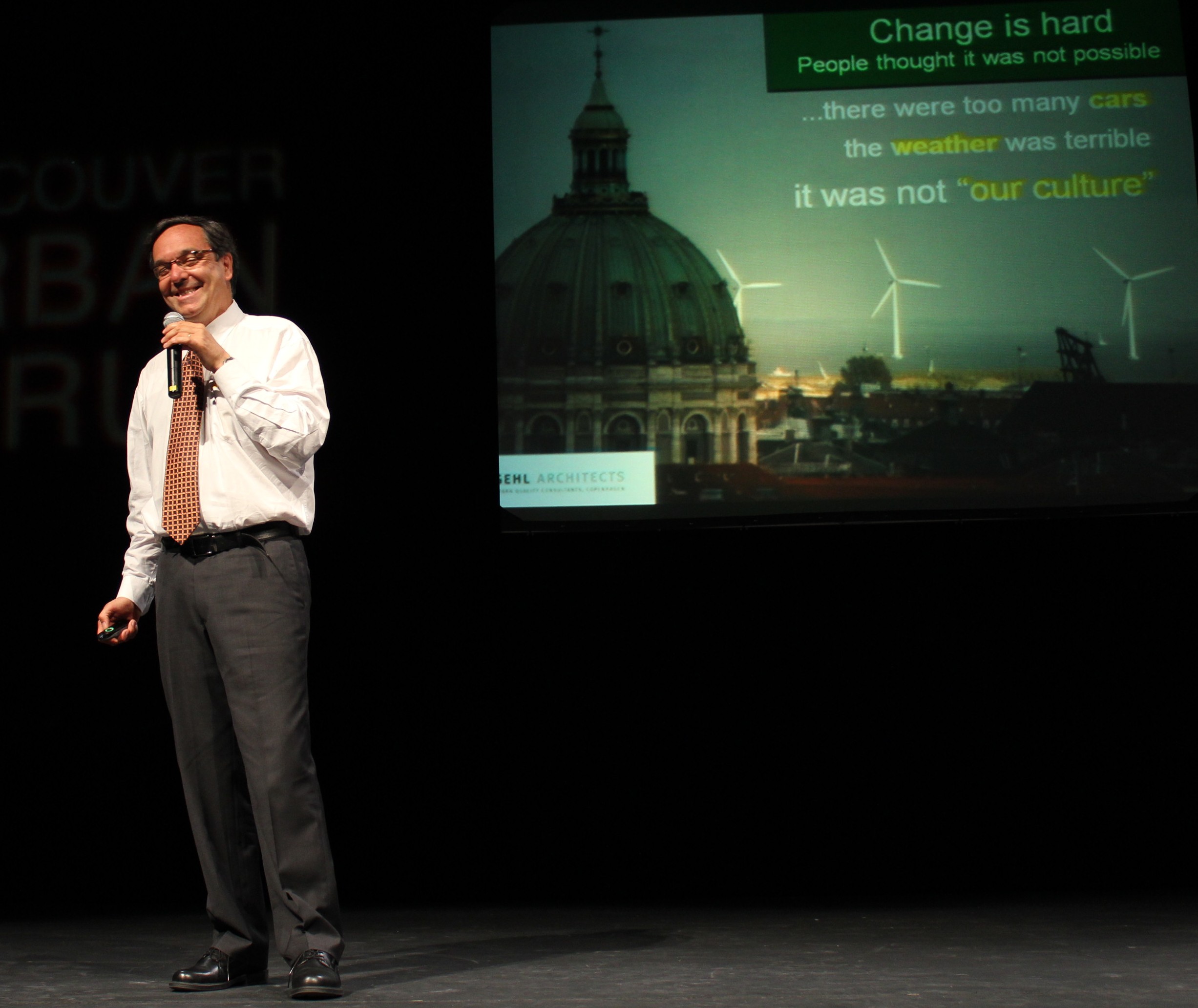 For example Cycling in Vancouver is mediocre, at best. I remember about 3 years ago I came to Vancouver and I was meeting with a head of an NGO and I said “I don’t know,Vancouver is so nice for pedestrians and so horrible for cyclists.” Oh, it seemed like I had insulted his mother. He was so upset, and he brought out his helmet and said. “WHAT DO YOU MEAN! I bike everywhere”. Then, on the way out of the office we past his assistant, a 50-60 year old woman who was a bit heavy, so I said to her: “Do you also bike to work?” and she said back “Oh, I wouldn’t dare to! I wouldn’t risk my life biking to work.” So I said: “Look, she made my point.” I said, “I’m not talking about you; It’s not about me, I don’t need the infrastructure (I bike all over the world.). I want my daughter biking… I want my mom biking. It’s for the others.” Sometimes people in Vancouver become too reluctant to change.