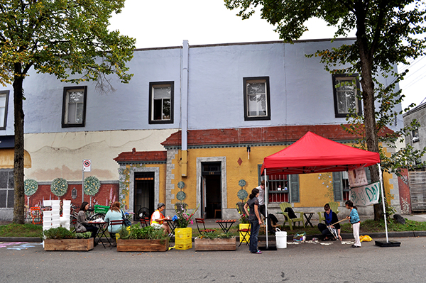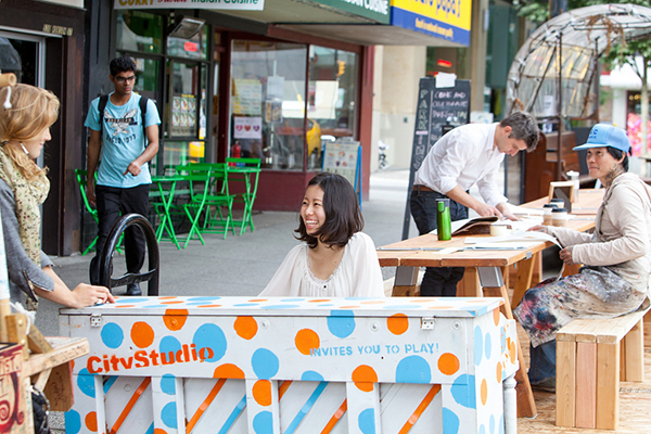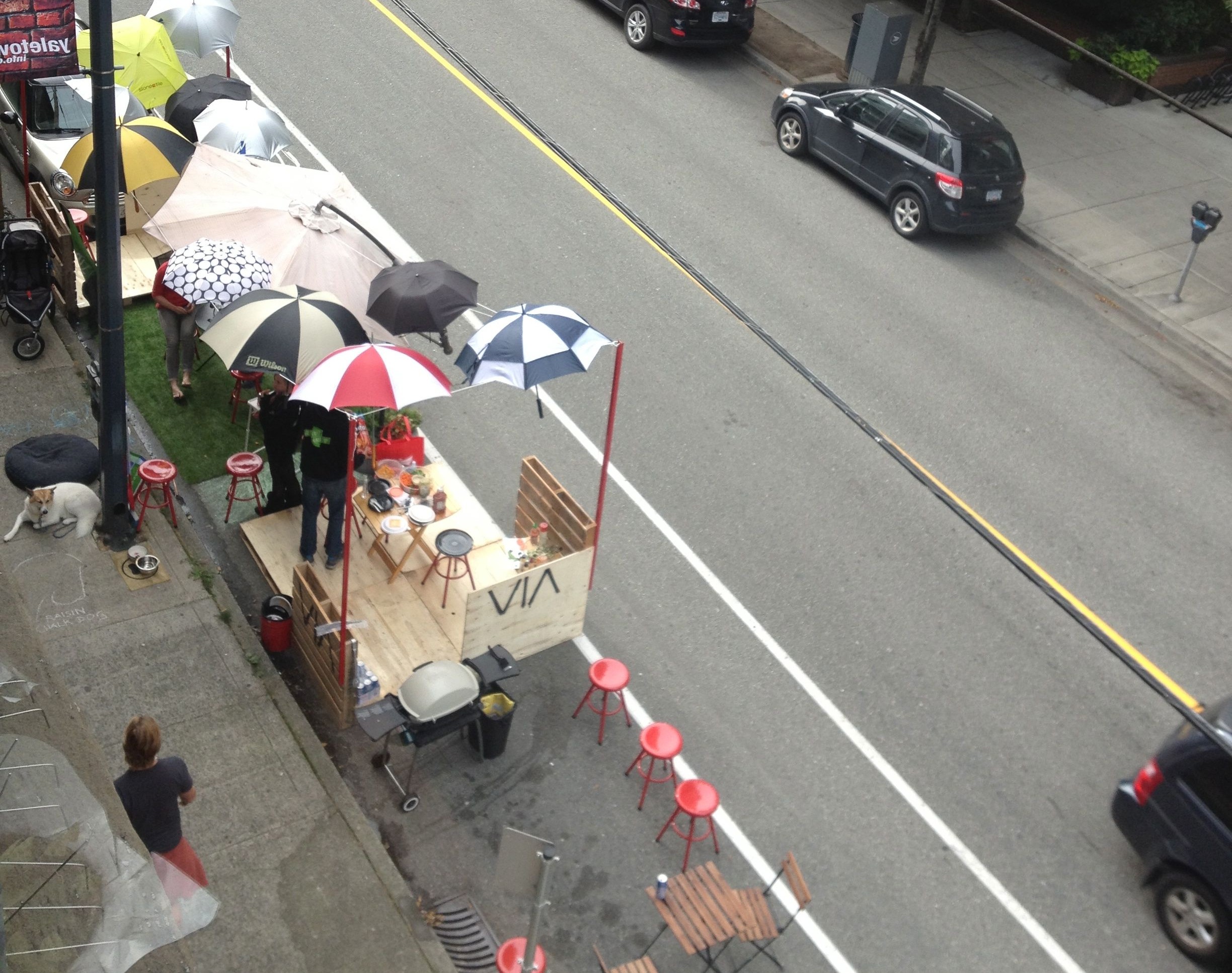 In Vancouver there were three successful installations where concepts about ways of sharing streets were conceived and built on parallel parking stalls to temporarily reprogram them for active use. The temporary public spaces at 500 Robson St downtown, 1050 Homer St in Yaletown, and 198 East 21st Ave in Mount Pleasant all created a more active streetscape to their neighbourhoods, even if it was just for one day. Designers and actors from a number of organizations came together to build these installations to illustrate ideals and movement towards a more inclusive and active system and ways of seeing streets as public places.