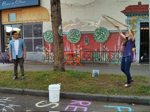 Enhancing the friendly character of the space, children and adults had fun with an organic bubble maker donated from The Soap Dispensary, located a block down Main St. Planter boxes from Coco et Olive bordered the traffic facing side of the Park(ing) Day installation, providing a comfortable buffer from moving vehicles.