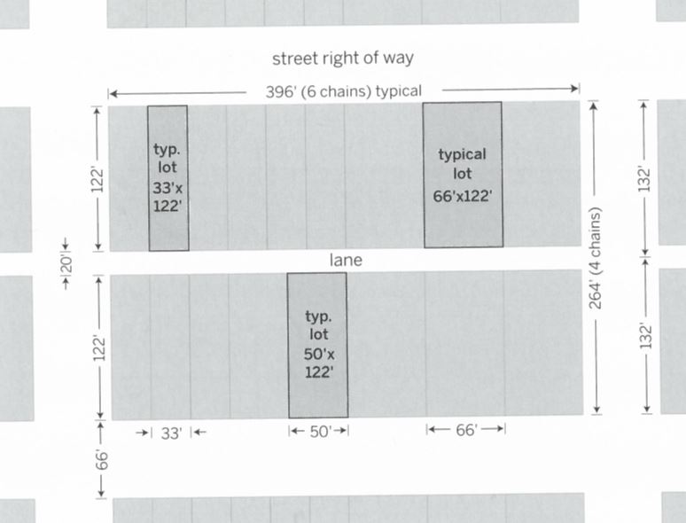 Single Family Housing became near ubiquitous in the interwar period. The city’s farm land was divided out along the grid of streetcars and developed further and further southwards with new tracts of housing. The surveys that defined properties for this grid were similarly focused on a streetcar suburbia. Outside of the early City’s Victorian core, and some of the Post-War ranch properties in the South of the city, most of this grid was divvied up into regular chain (66ft or ~20m) lots and blocks. Depending on configuration that meant that the most common type of lot in the city was a half chain (33ft or ~10m) wide. Lanes divided almost every block most were and were 20ft (or 6m) and most blocks were 4 chain deep. That meant that the most common development lot in the city had a shared scale of approximately 33ft x 122ft (~10m x ~37m). There are variations, but this lot type is almost ubiquitous.