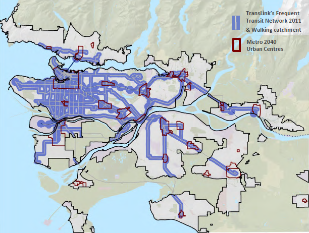 The map presents the network of Frequent Transit Routes expected in the city over the next few years and highlights the routes presented in both Translink and City of Vancouver transportation plans. Major rapid transit stations on the existing SkyTrain have been marked and 5 minute and 10 minute walking circles have been overlaid onto the map. It is striking to see how many lots of single family housing are present within these station areas. Areas outlined in Blue are either Frequent Transit Network development areas or Planning work currently underway and completed by the city to create new transit oriented multi family zoned urban centres.