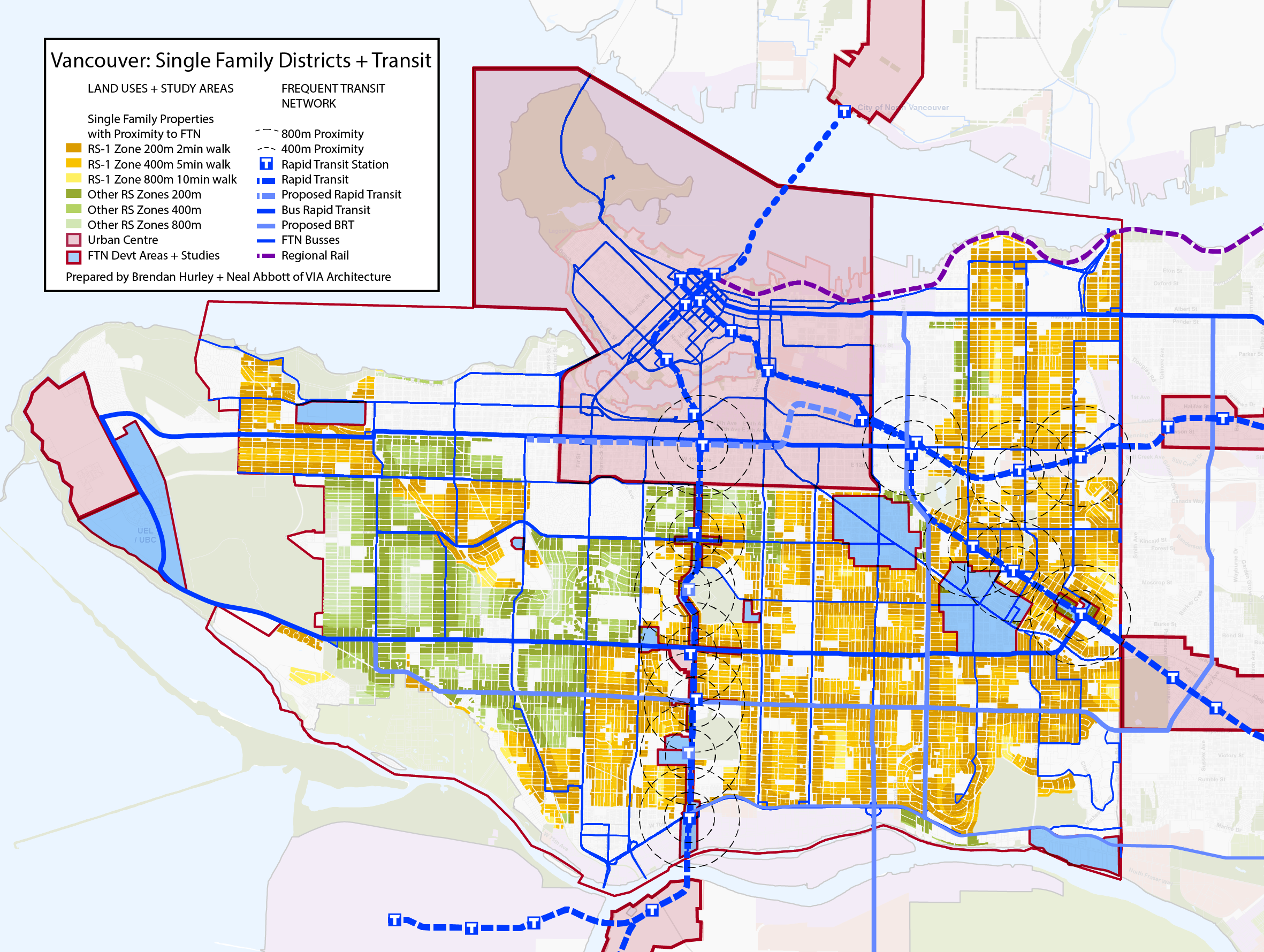 Vancouver is a transit oriented city that has a near complete grid of Frequent Transit Corridors – most of which were set into place in the Streetcar era. It is rare for properties to be more than 800m – about a ten minute walk – from one of these transit routes. Yet, it is easily observed that beyond some directly adjacent commercial districts, and a few neighbourhood planning study areas, much of the land base crisscrossed by this transit is still dominated by single family district regulations. Precincts around stations and transit are powerful places to increase densities and maximize transit use, but what about the rest of the City. As we look to a more connected and complete city, we chose to begin by analyzing how this relationship between single family housing and transit were interrelated.